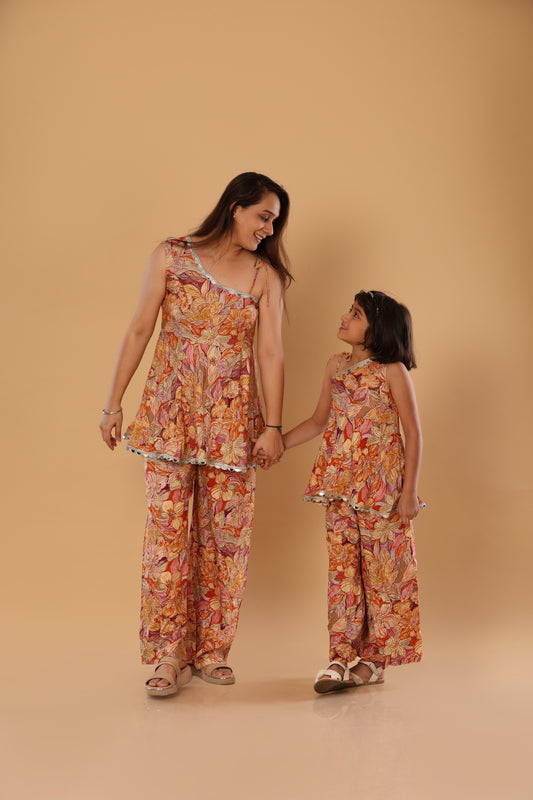 Mother Daughter Duo/ Floral Print Off Shoulder Set- Orange