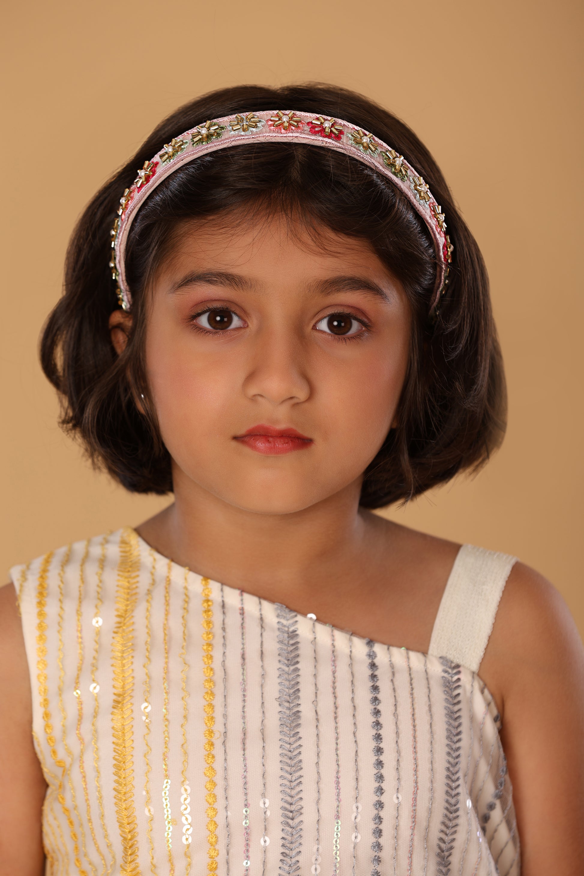 Baby Pink Hand Embroidered Flowers with gold threadwork, Wear a flower-like a crown with breezy dresses, semi-casual, traditional. Fits for both Kids and adults.