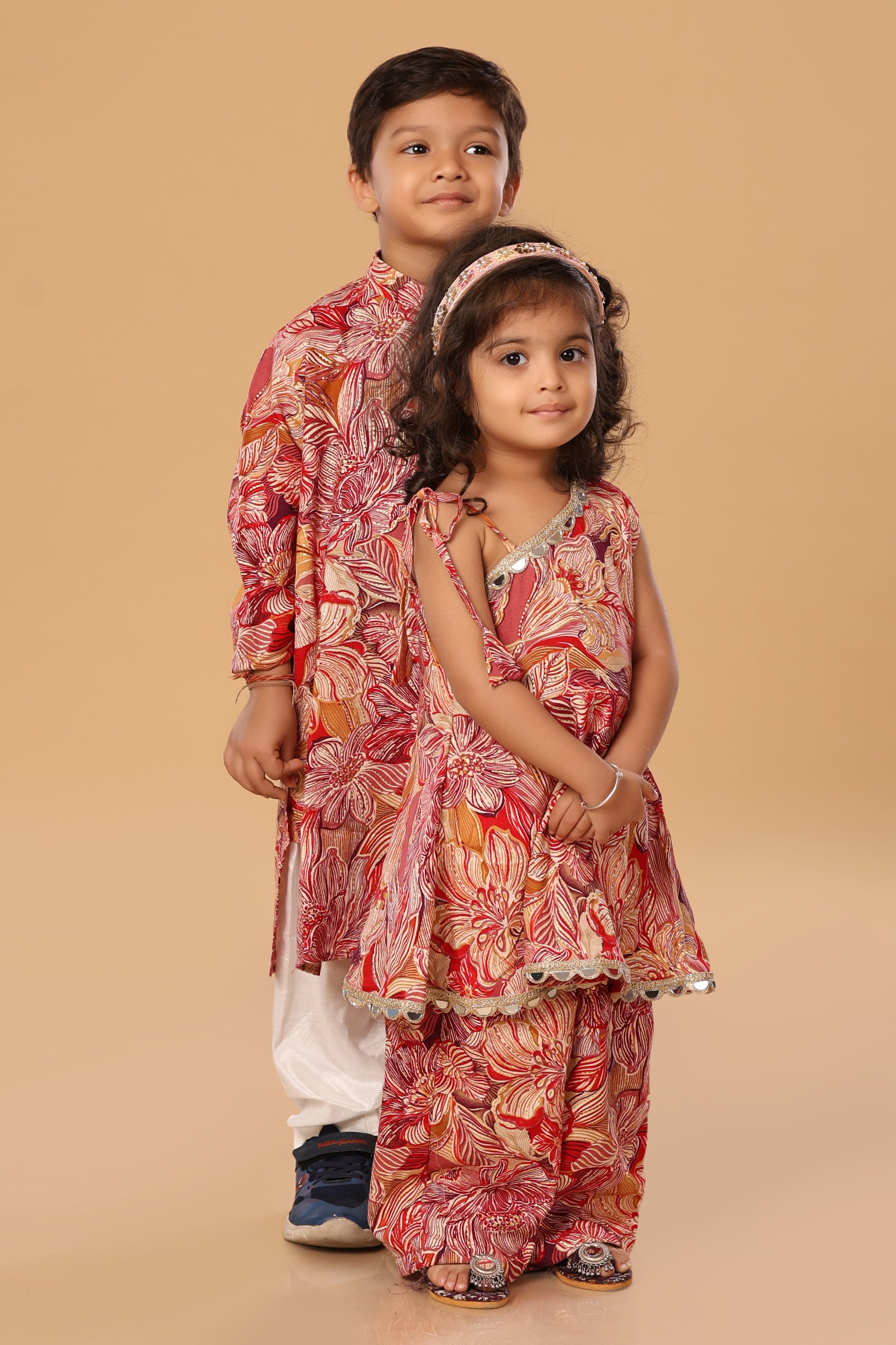 A graceful set featuring an off-shoulder tunic top with delicate lace detailing, paired with flared pants for her. For him, a round-neck straight kurta with matching pants. Crafted from a self-textured cotton blend, enhanced with printed foil and floral work for a refined look.