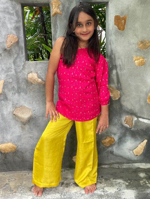 Shoulder Tunic Top With One Side Sleevee along with Flared Pant.