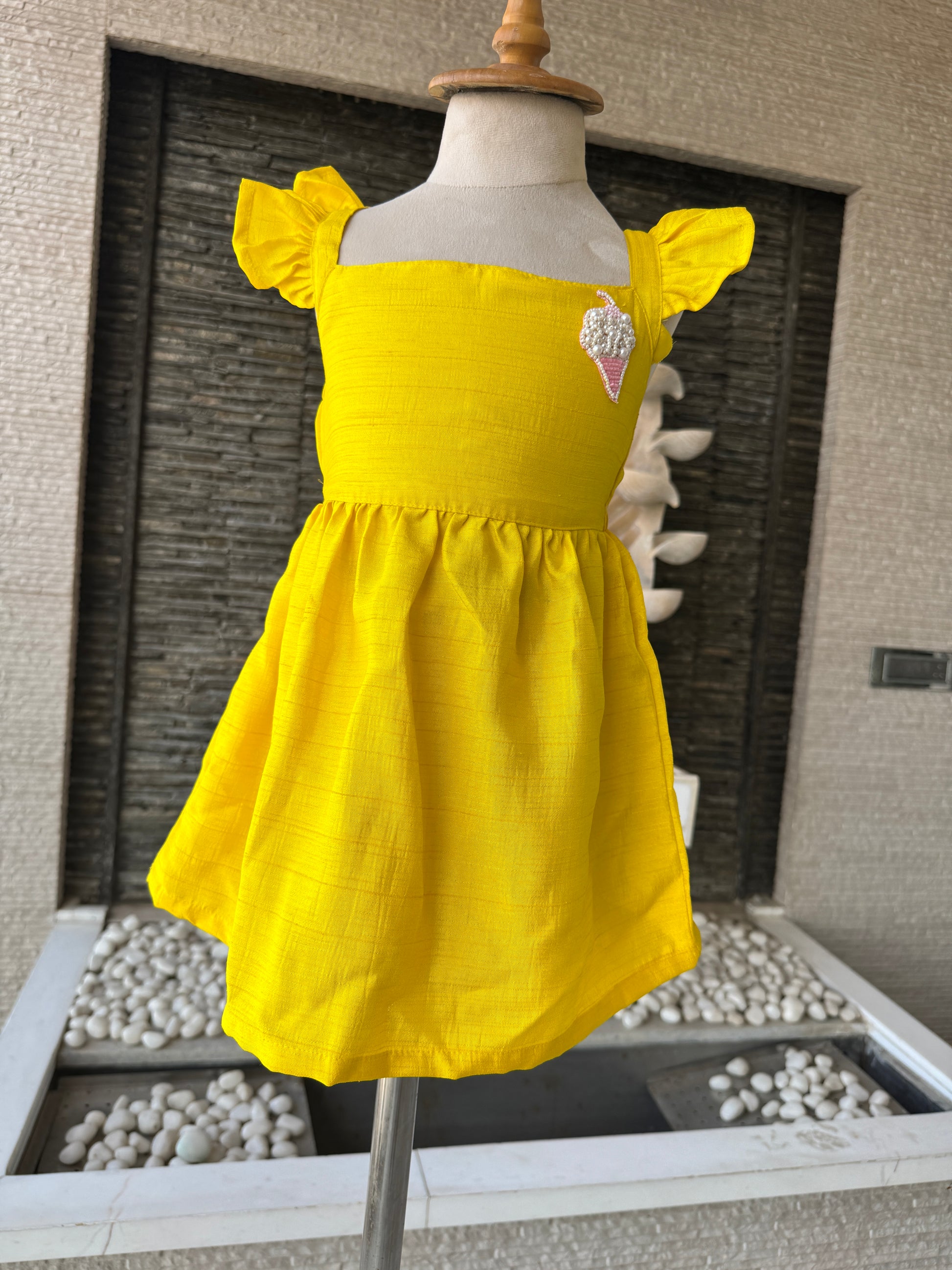 Its Breezy, playful,comfortable, stylish - Perfect for nani house visits, brunchies, birthday parties. 100% Cotton, this dress has been design with ruffled sleeves crafted with handmade ice cream shape embroidered beads, with gathered cross back detailing.