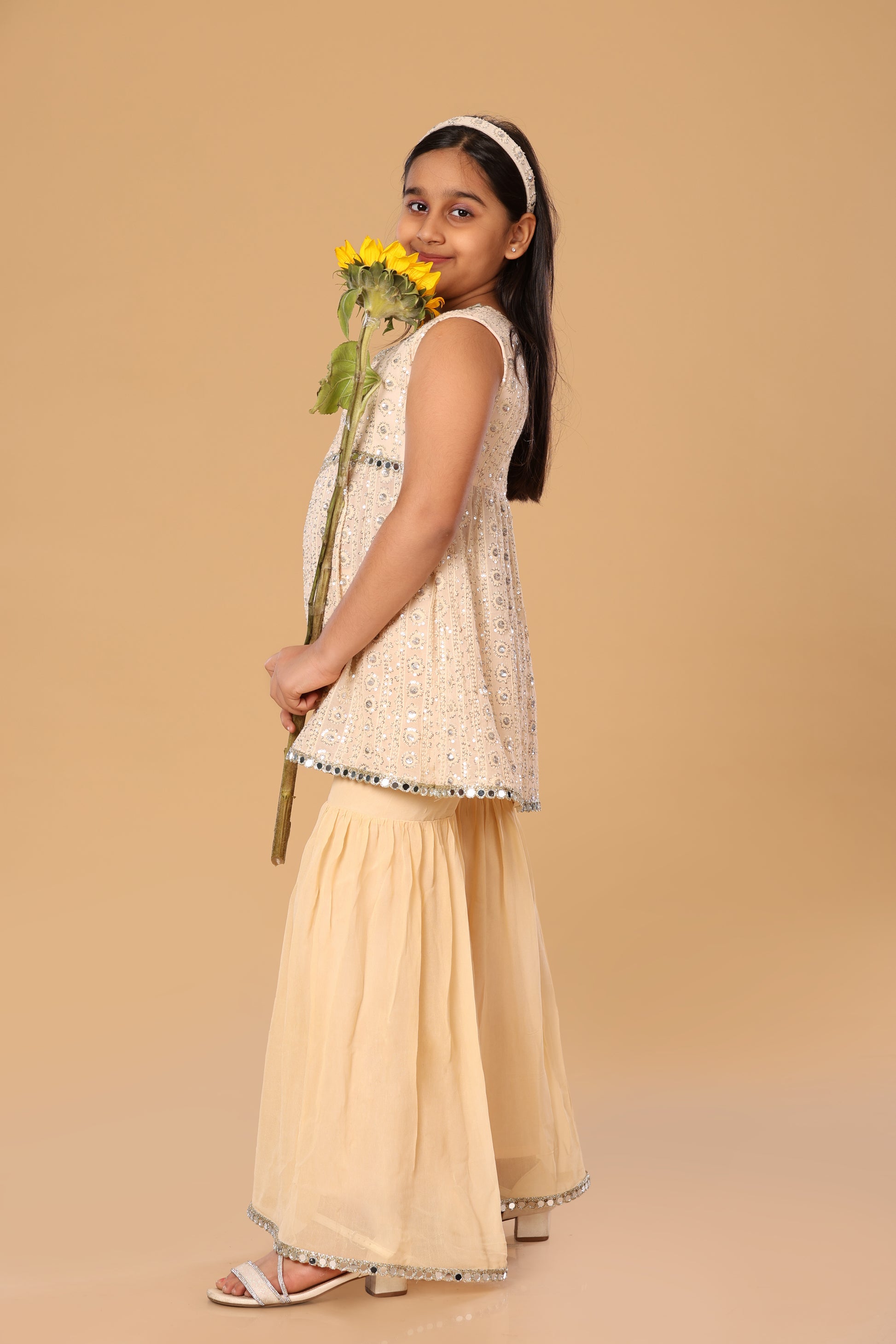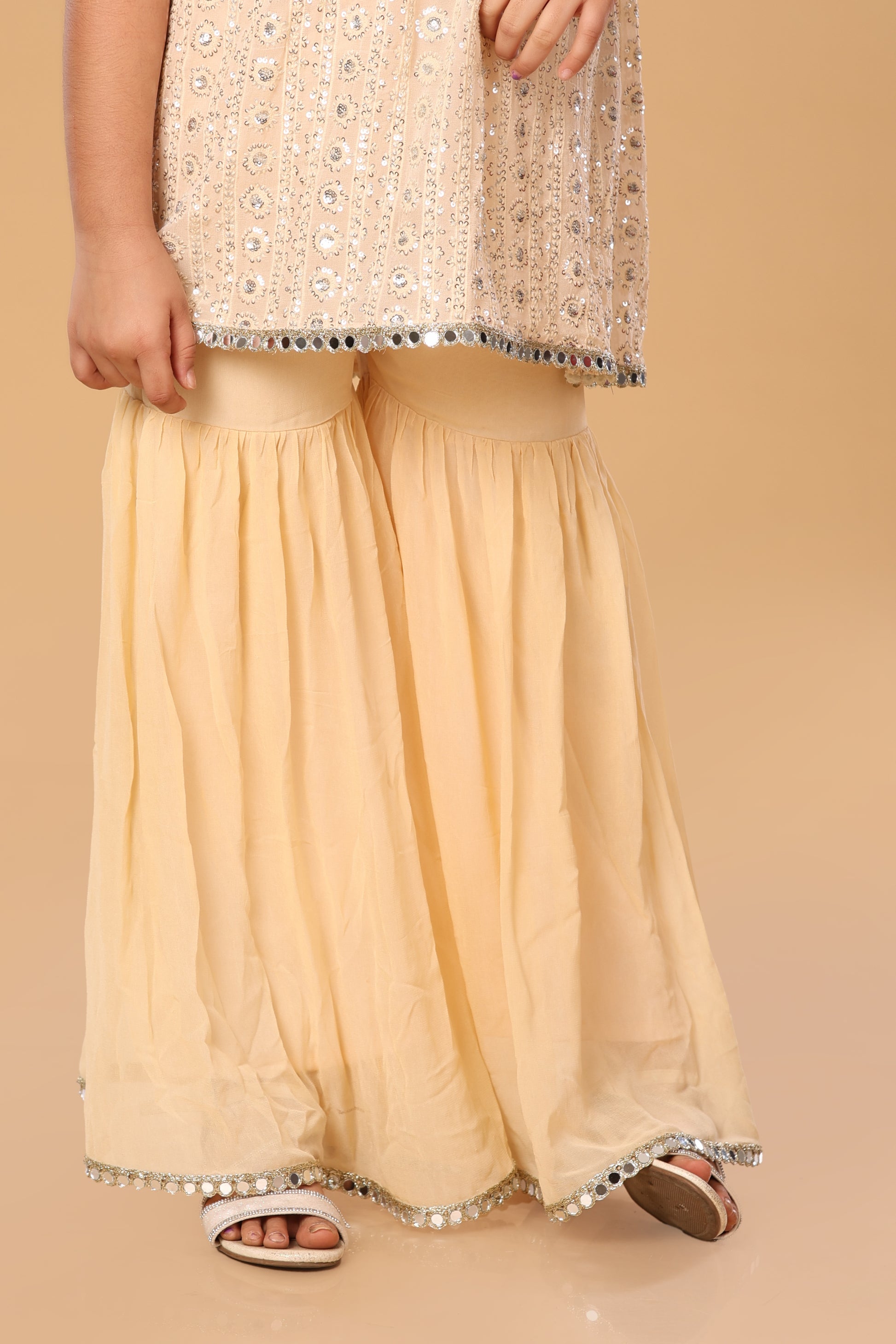 This set comes with a sleeveless round neck emblished with mirror lace kurta along with sharara.