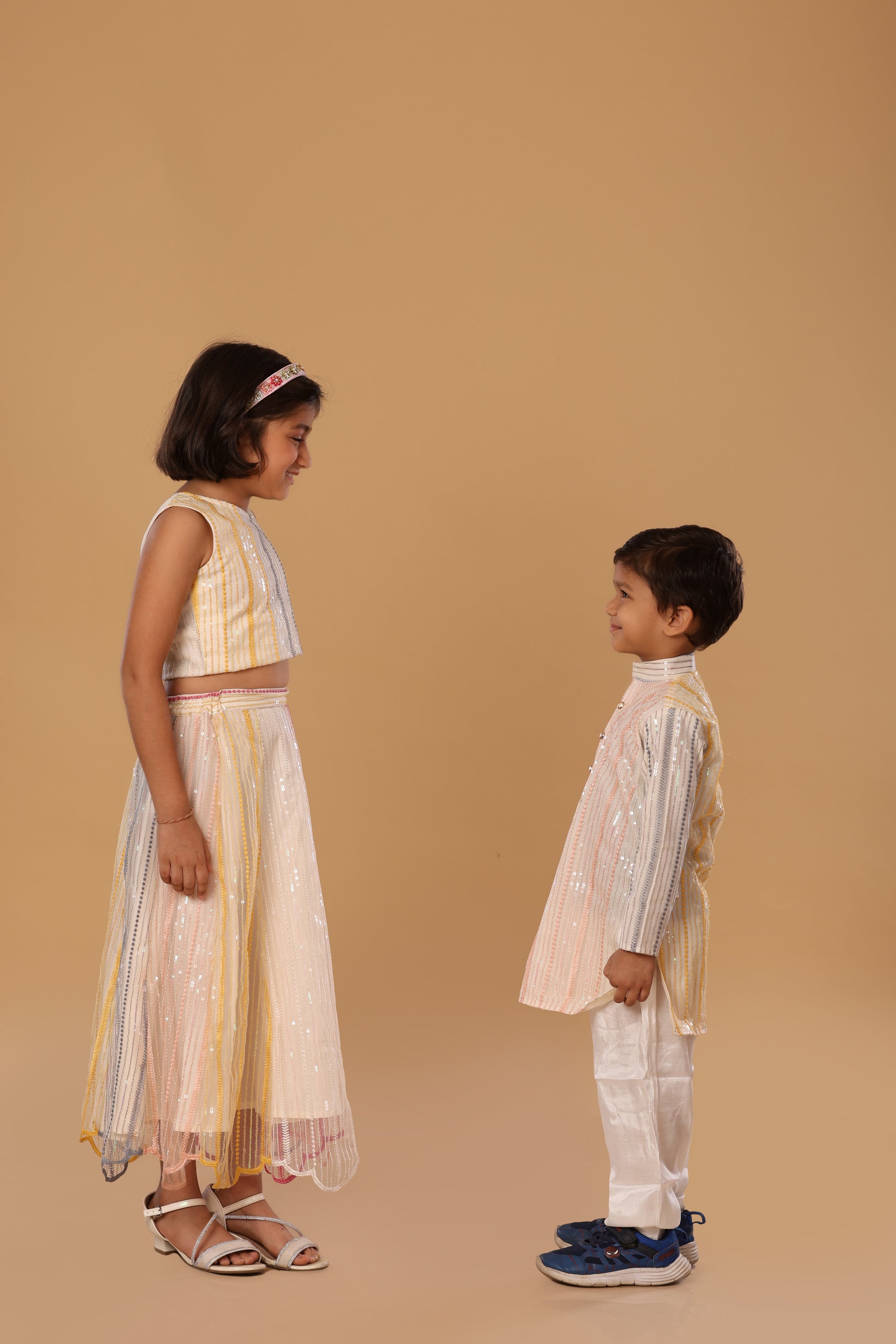 This elegant set features an off-shoulder blouse with attached straps and inner lining, paired with a flared lehenga for her. For him, a classic round-neck straight kurta with matching pants. Designed in a self-textured cotton blend on net, highlighted with delicate threadwork for a refined look.