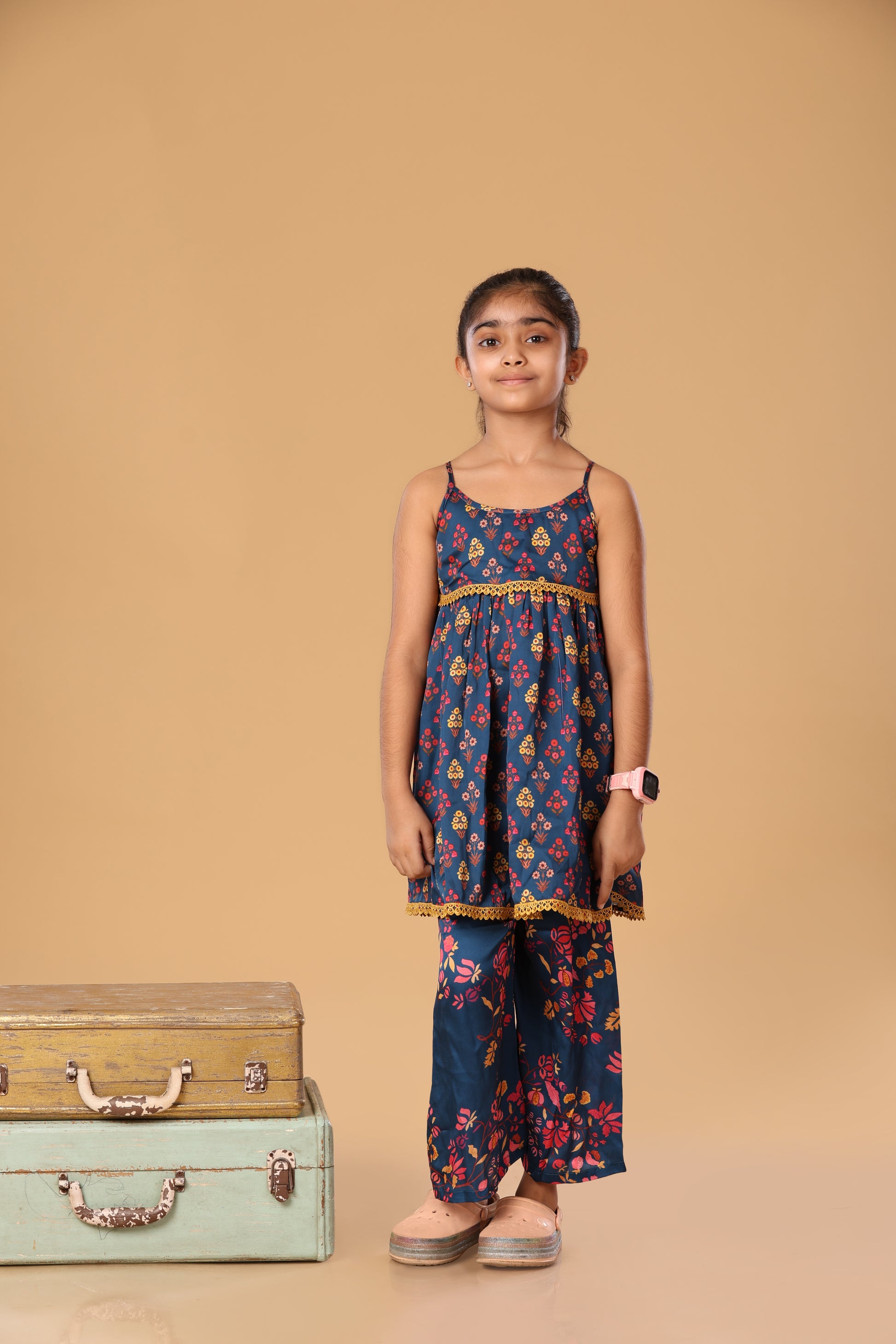 Spaghetti Tunic Top is attached with lace and flared pants.