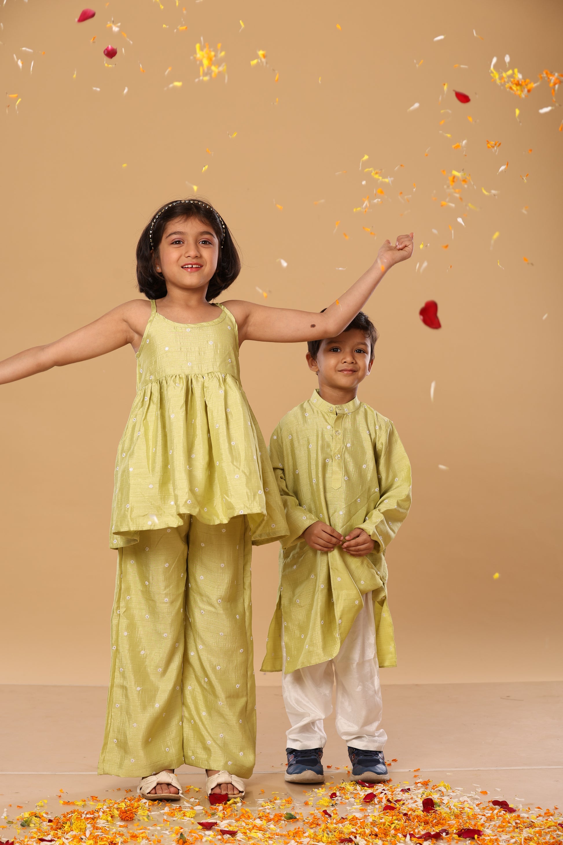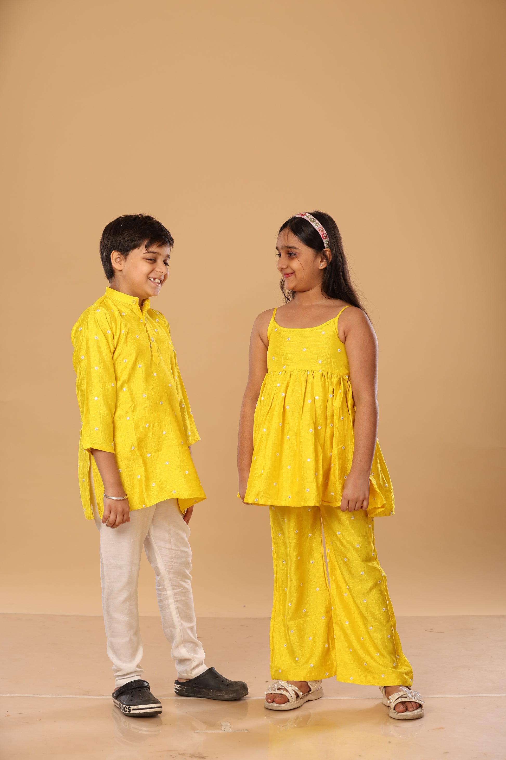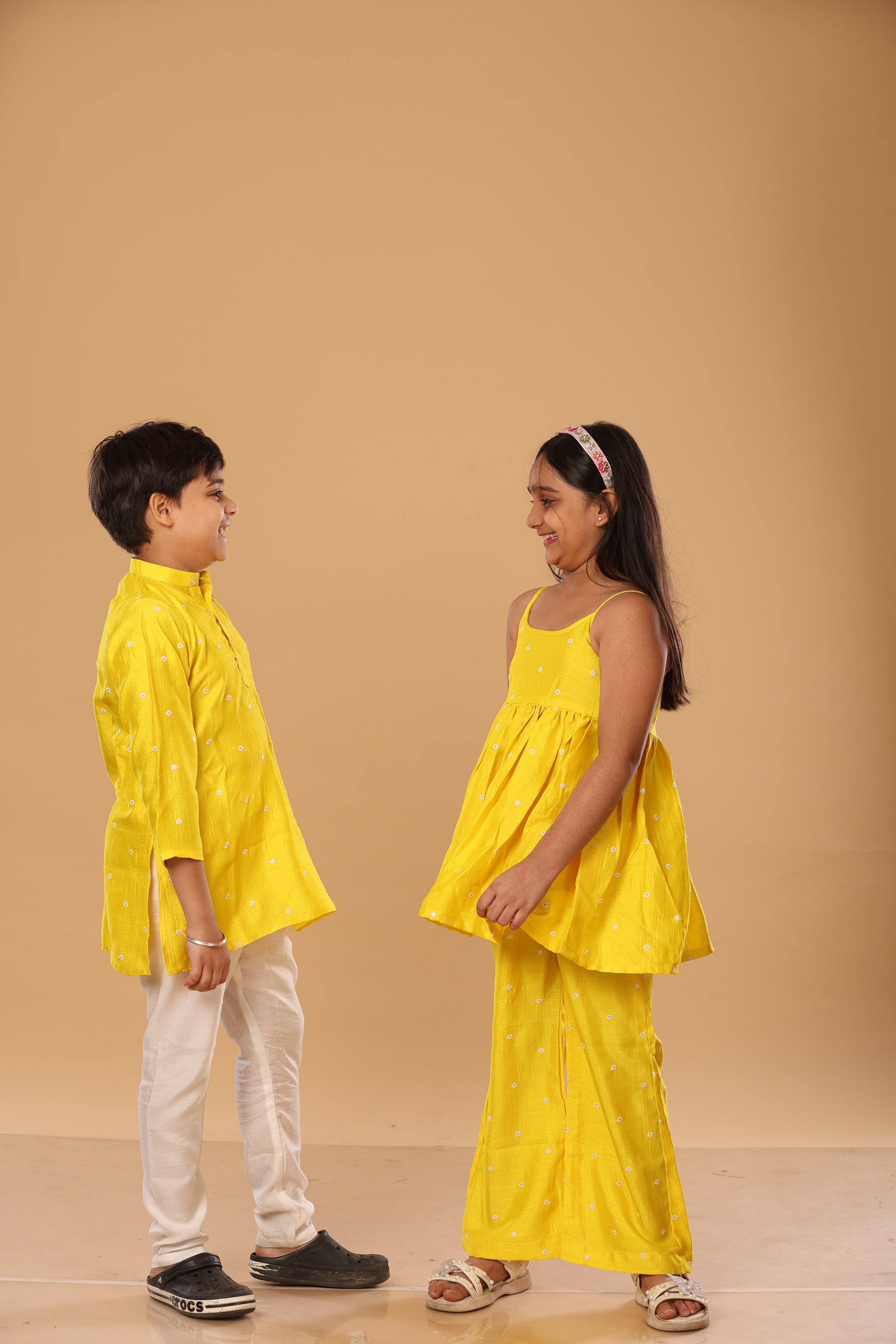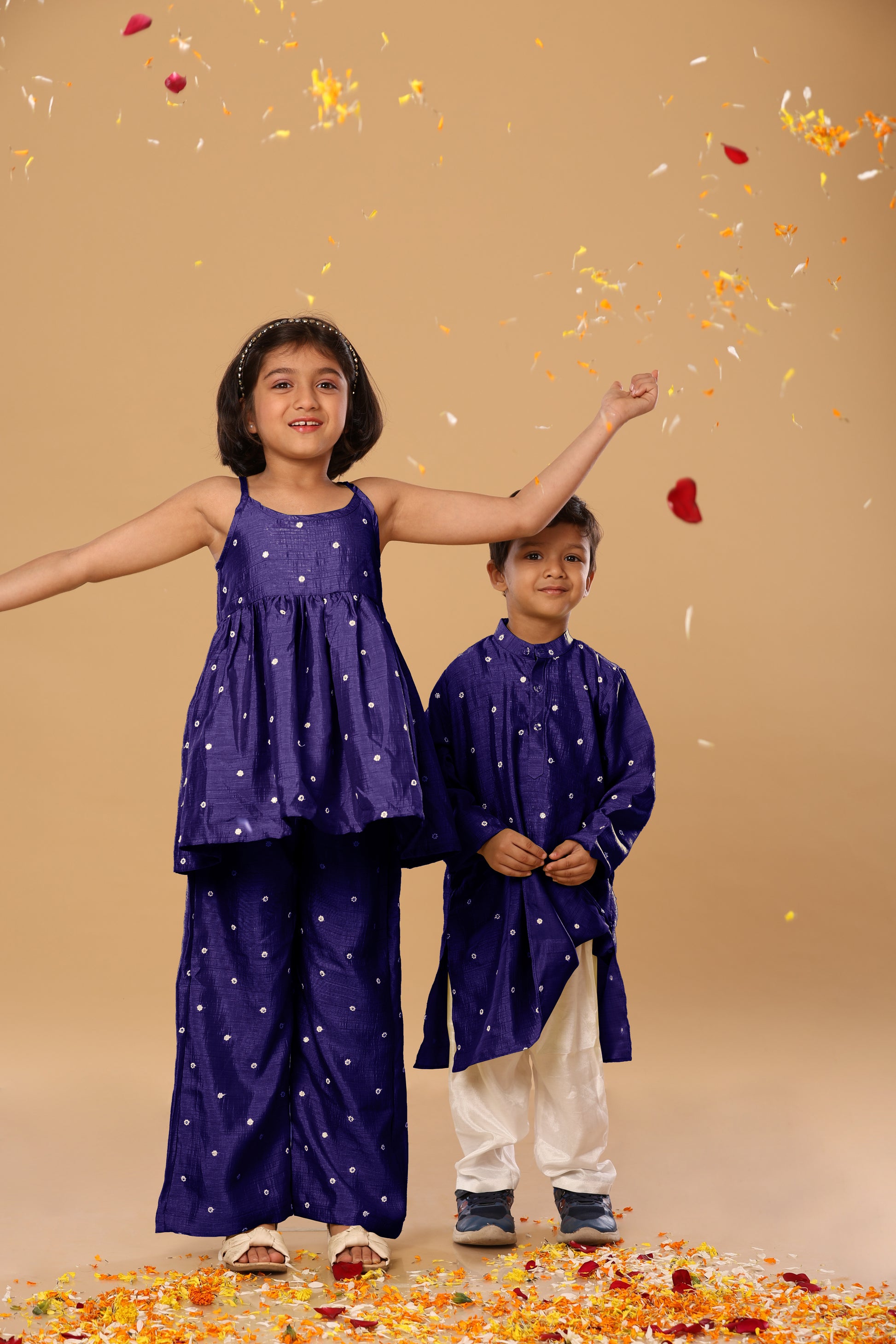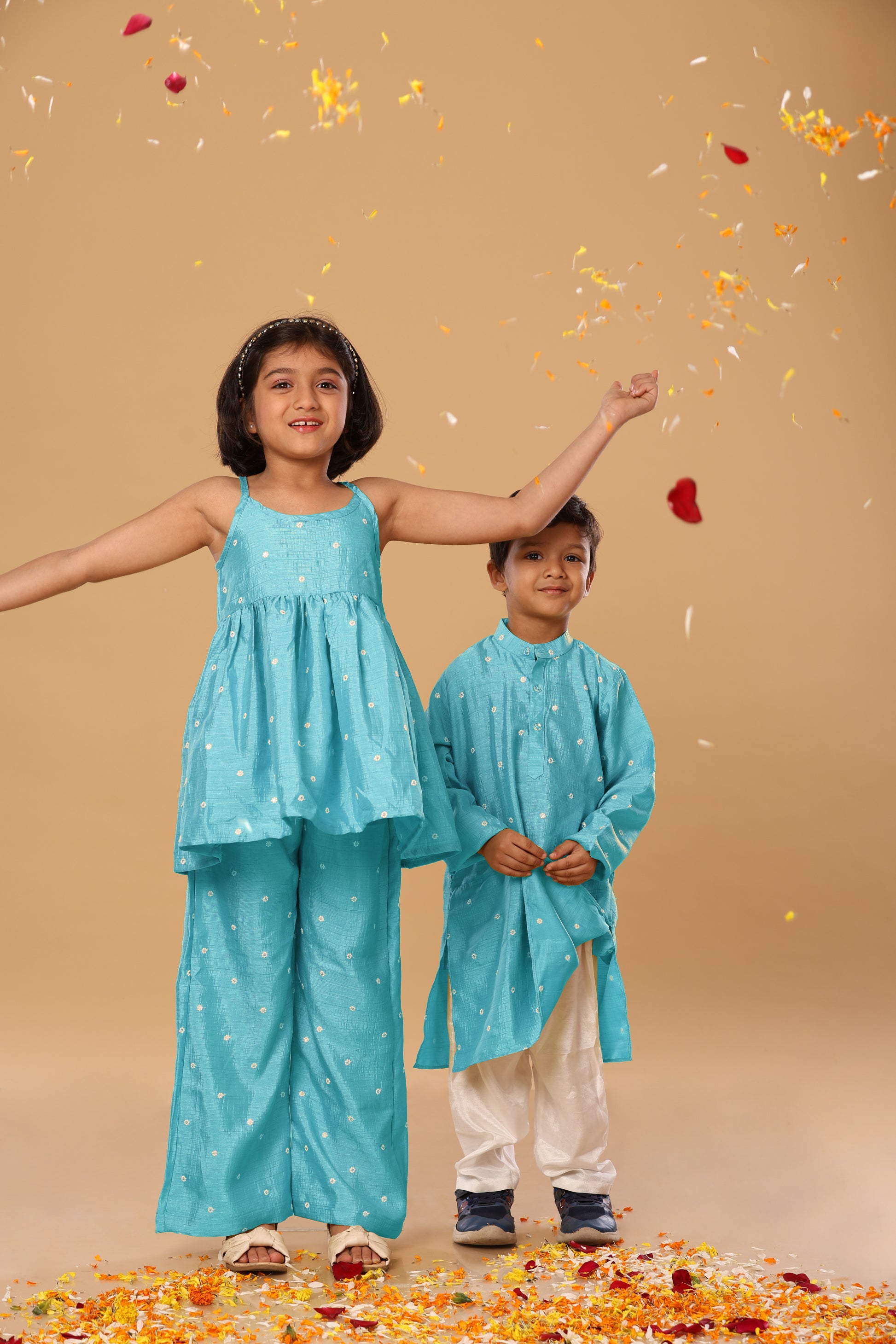 Crafted from self-textured cotton blend, this set features a spaghetti-style tunic with flared pants for her and a round-neck straight kurta with matching pants for him. Adorned with white thread work for a timeless appeal.